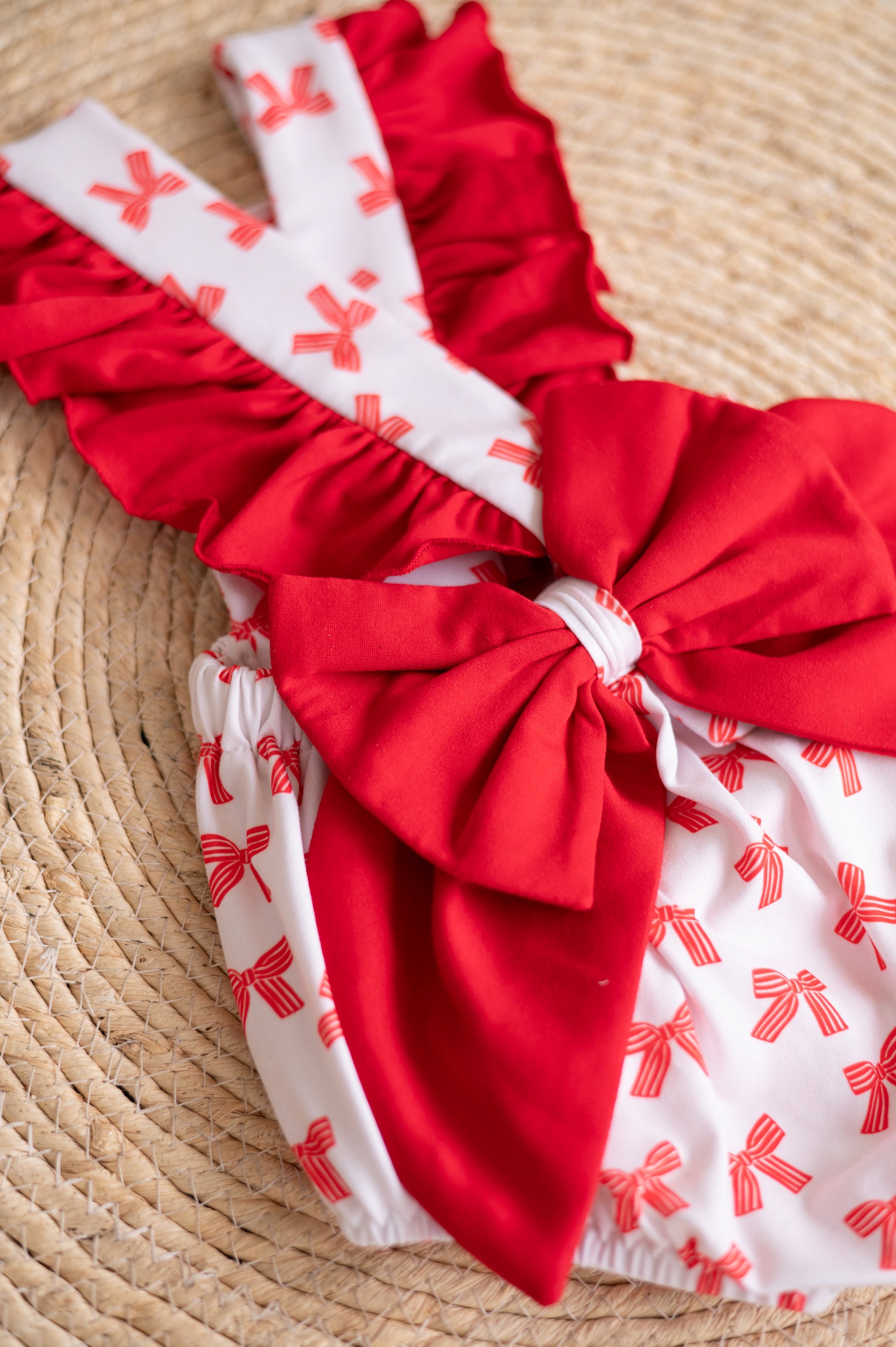 Dress your little one in festive cheer with this adorable Christmas romper! Featuring ruffled red straps, a criss-cross back, and the sweetest oversized bow, this romper is made for holiday magic. The white base with playful red bow prints adds a whimsical touch, while the bright red fabric brings classic Christmas charm.