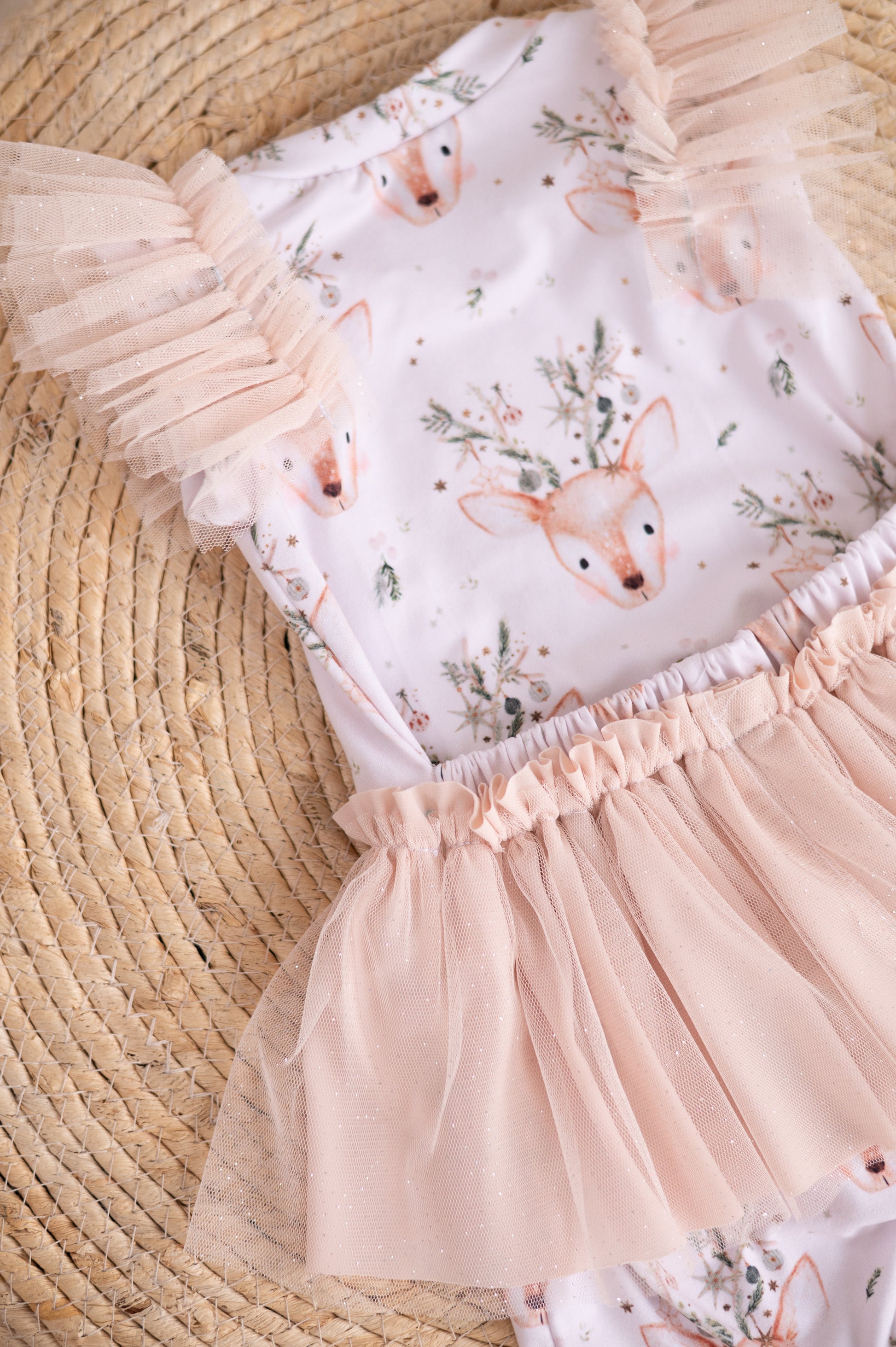 Bring festive magic to your little one’s wardrobe with our Winter Christmas deer Tulle Romper. This enchanting piece blends seasonal charm with a sweet whimsical style — featuring a soft base sprinkled with watercolor fawns, delicate greenery, and subtle holiday accents. The blush tulle frill sleeves and tutu skirt add a whimsical touch, perfect for Christmas photos, family gatherings, and those treasured festive memories.