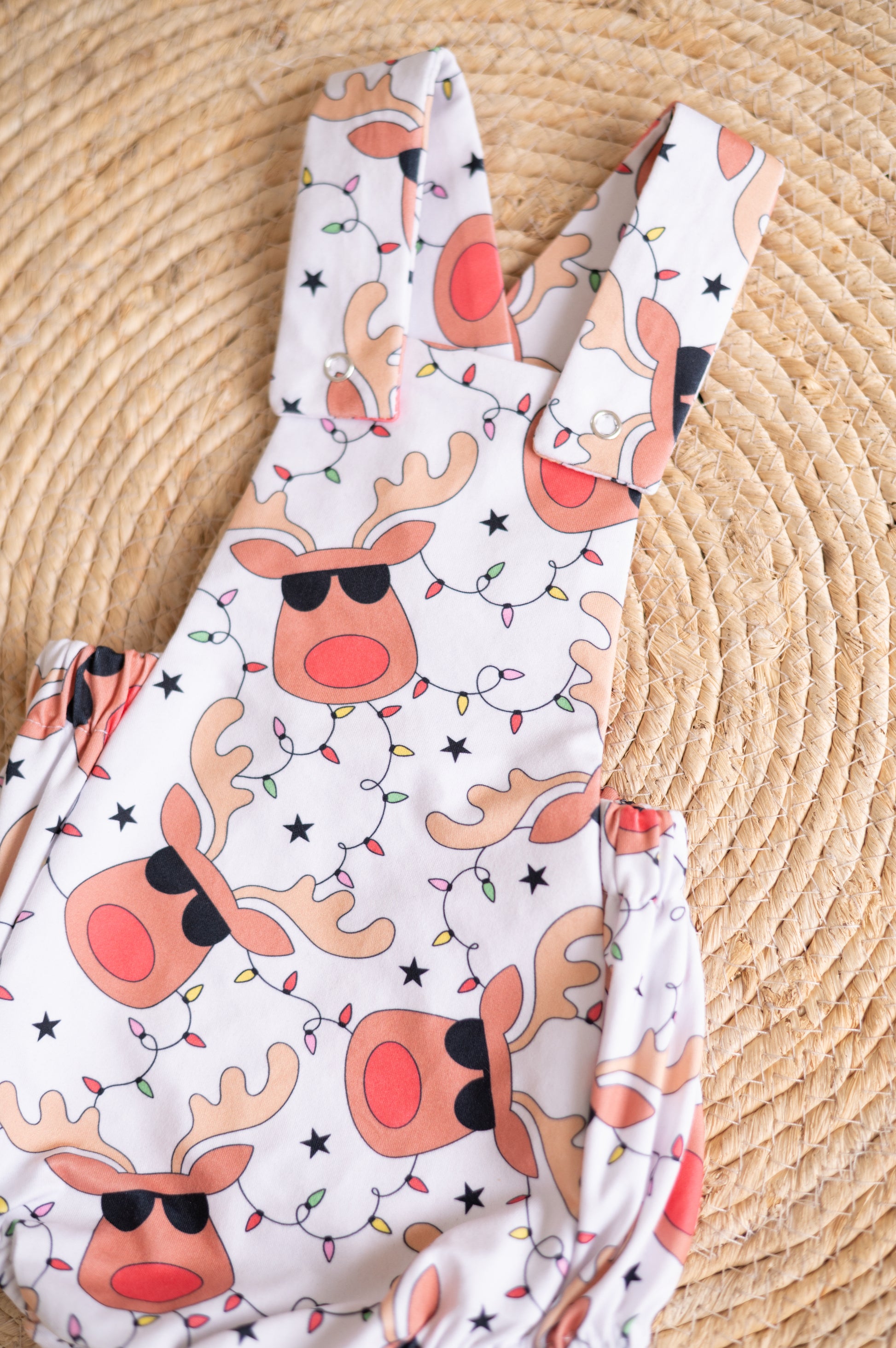 Dress your little one in festive style with this playful Christmas romper! Featuring trendy reindeer rocking sunglasses and wrapped in colorful f lights, this outfit brings holiday cheer with a modern twist.