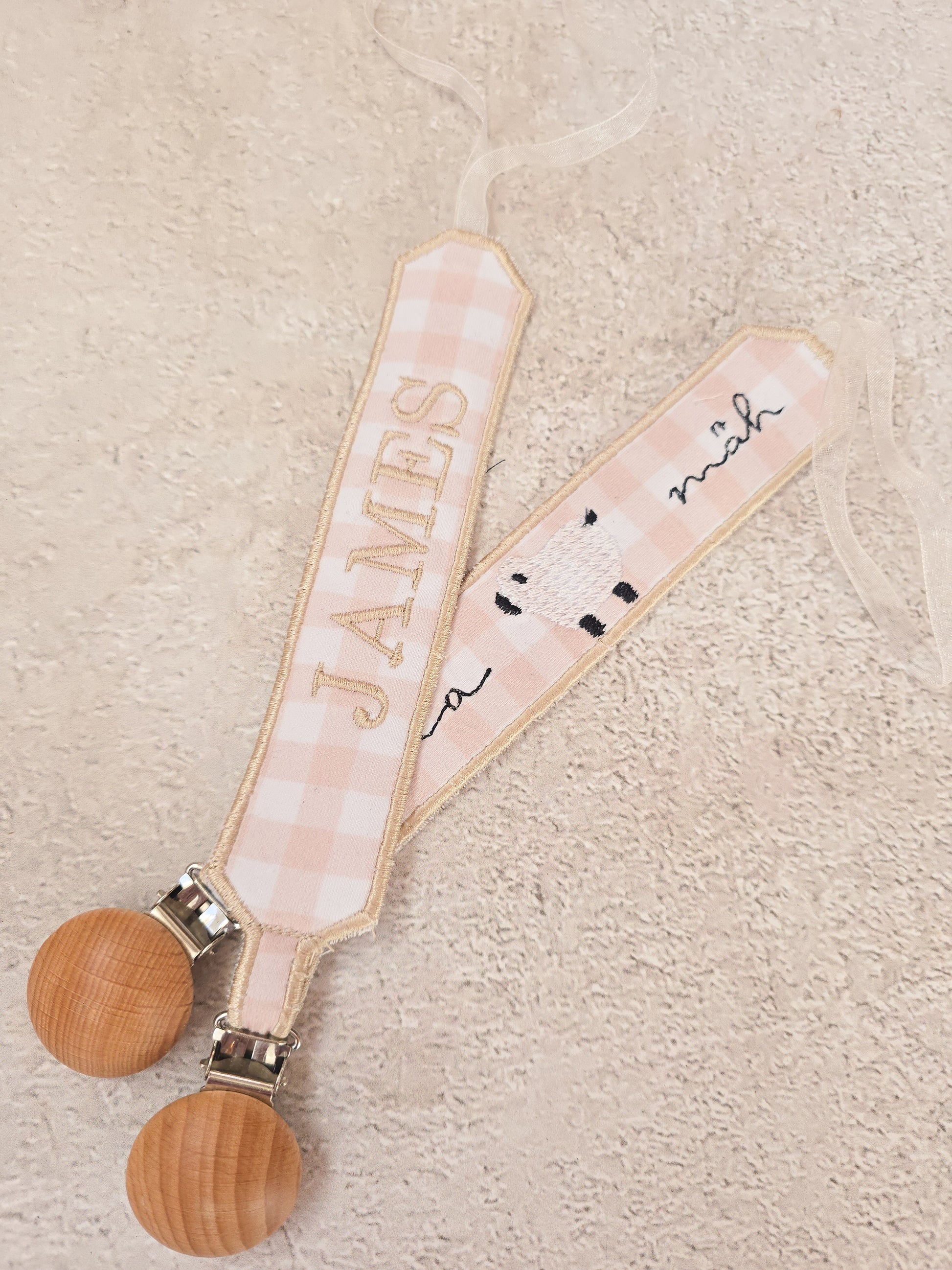 Keep baby's dummy clean, close, and stylish with our Personalised Dummy Clip in soft beige gingham. Made with high-quality fabric and a smooth wooden clip, this accessory is as practical as it is adorable. Embroidered with your little one’s name, it adds a special, personalised touch to their everyday essentials.