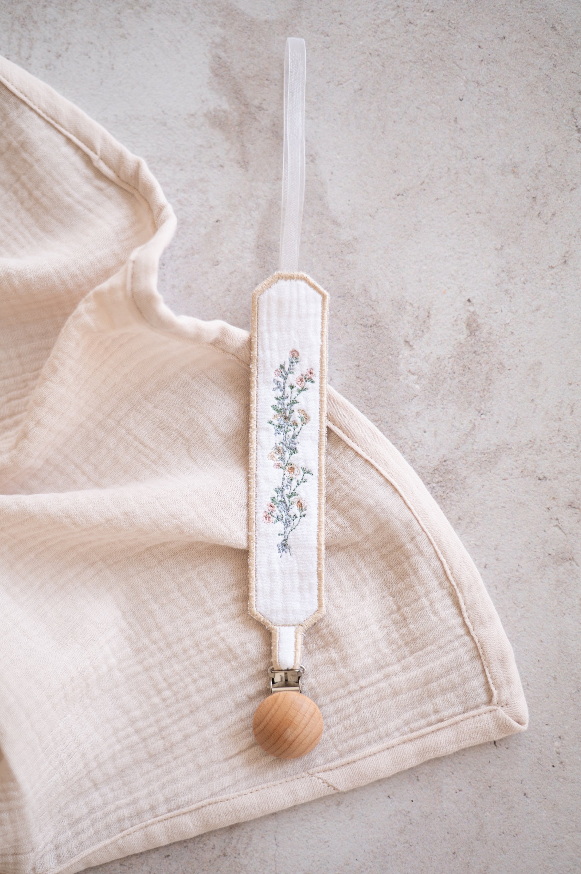 Add a touch of timeless charm to your little one’s essentials with our Wildflower Dummy Clip. Featuring delicate floral embroidery on a soft whitr base, it perfectly complements our personalized wildflower blankets and makes a beautifully coordinated set.