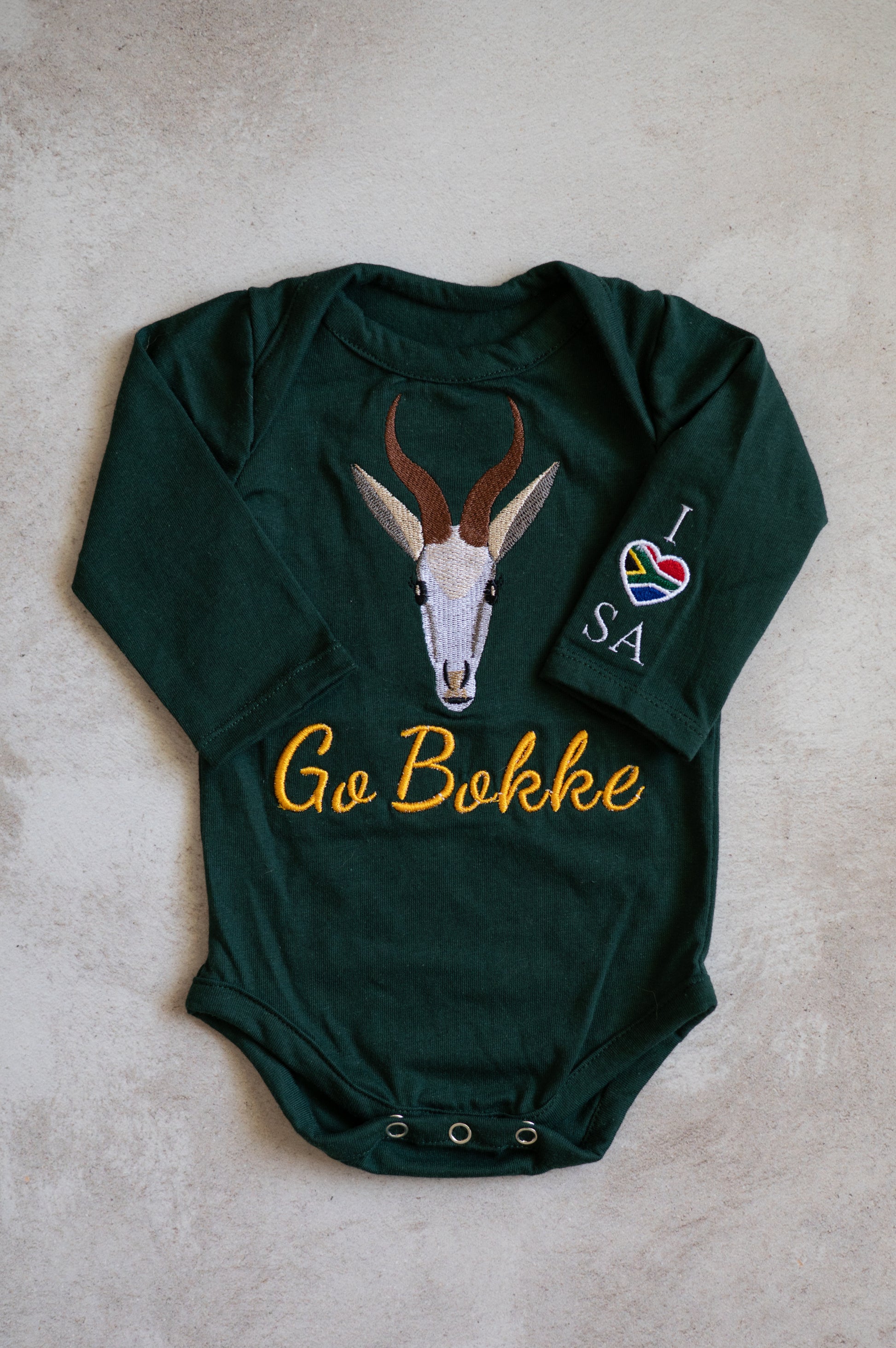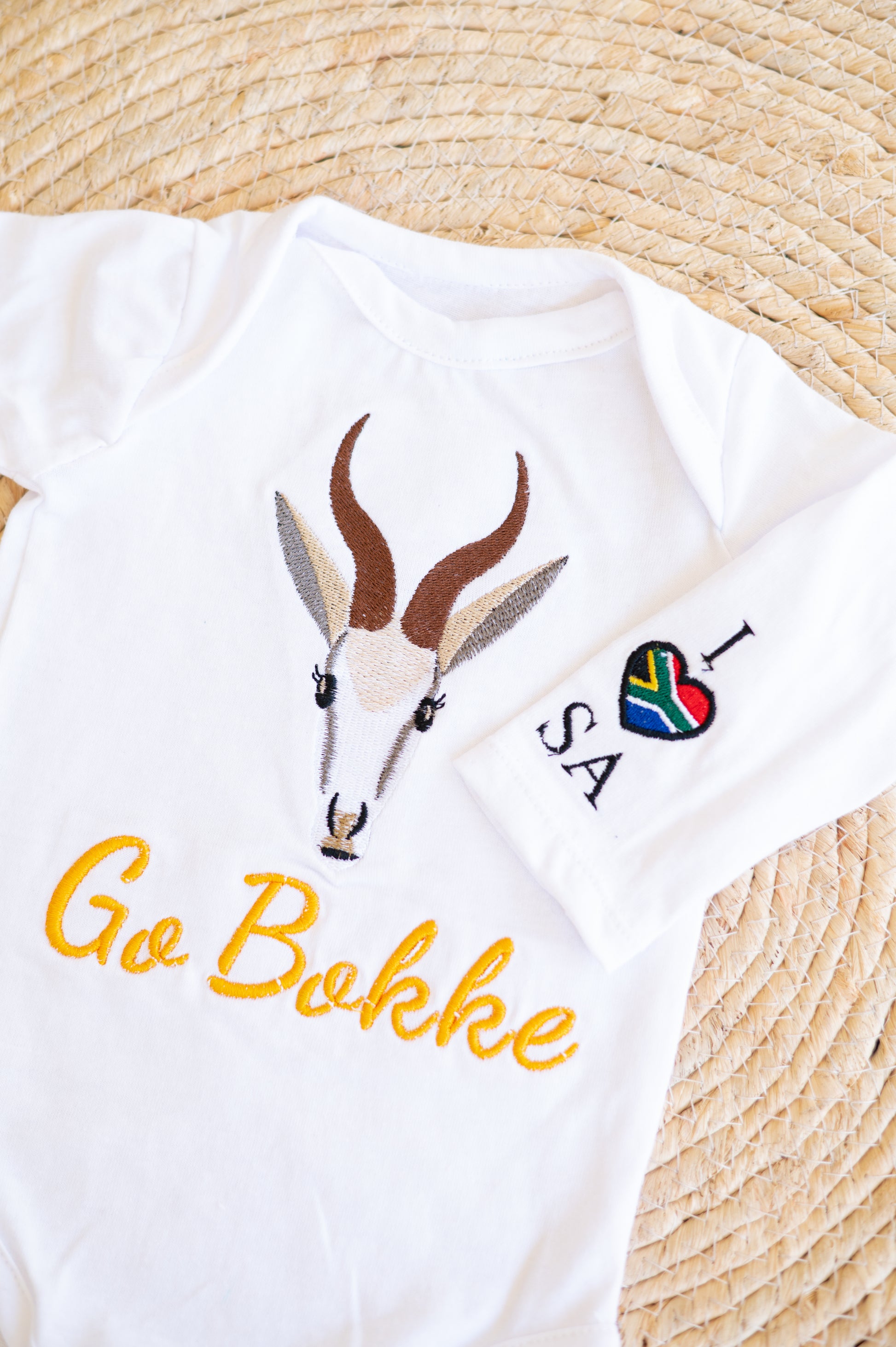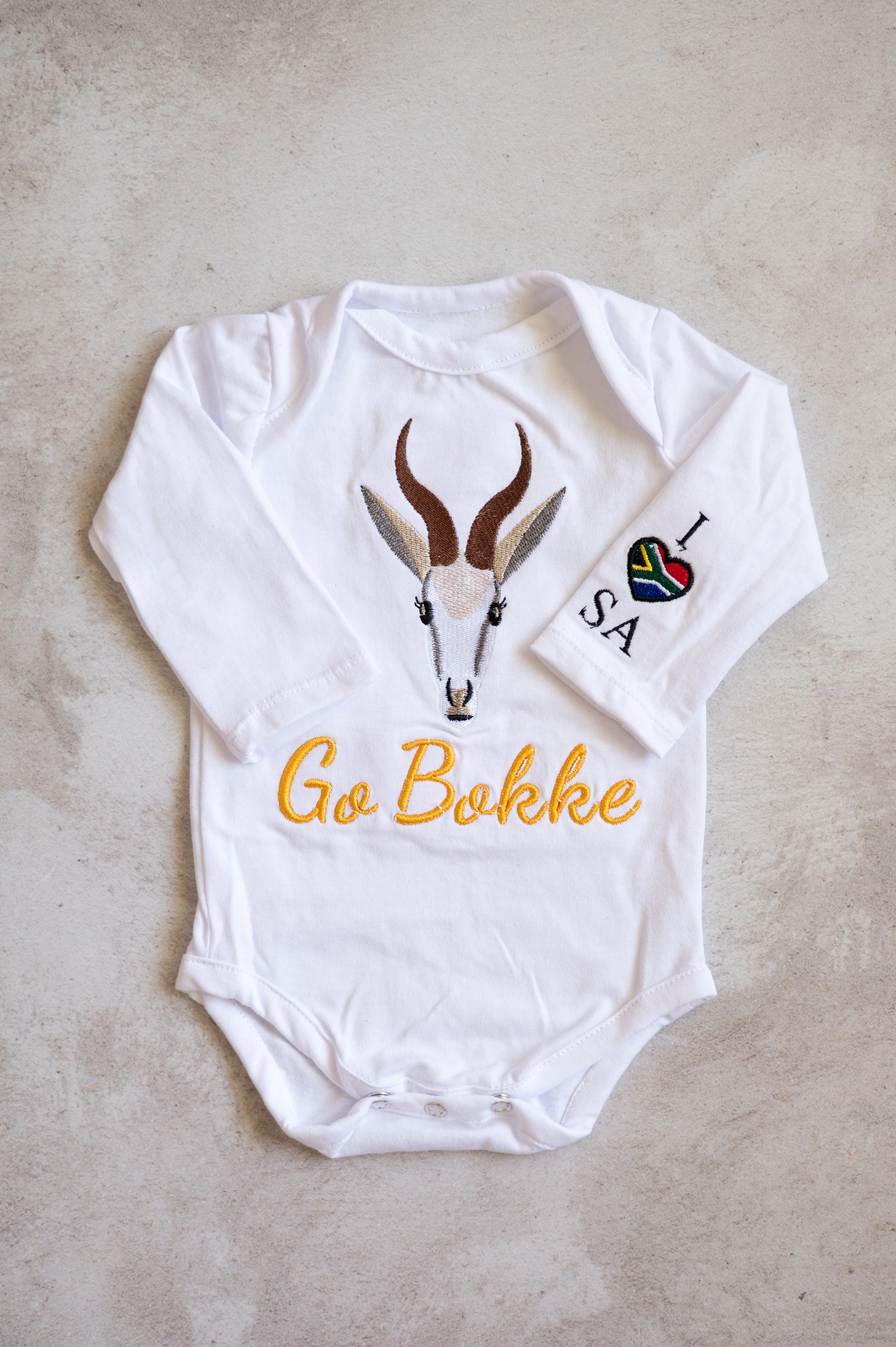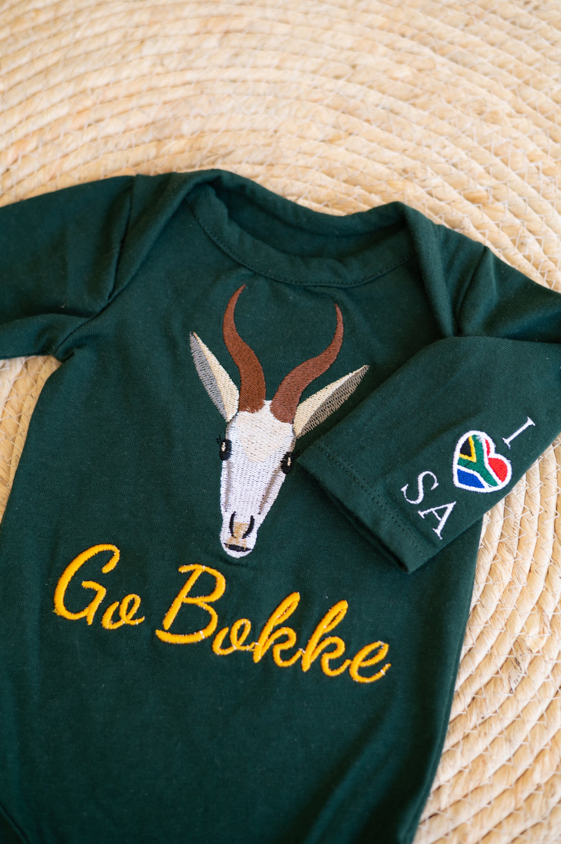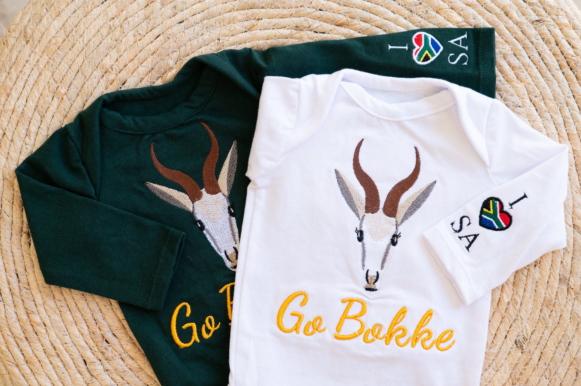 A high quality cotton onesie and Springbok front and S.A flag sleeve stitching gives your little one a unique supporters outfit for those exciting game days!