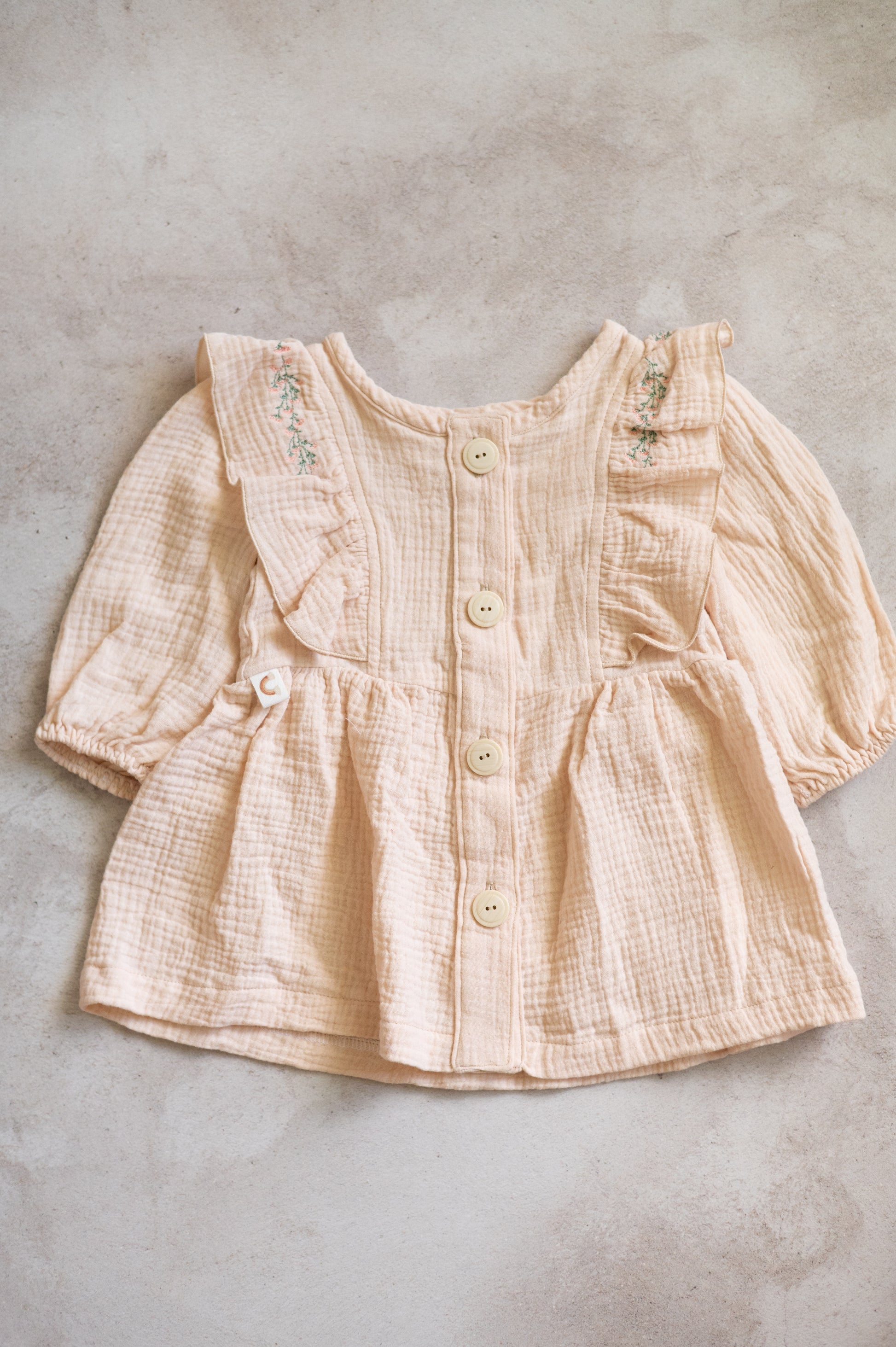 CLothing items with press stud buttons need to be handled with care. PLEASE do not pull on the fabric as the press studs can rip and tear the material. Gently place your fingers onto the press stud and tug gently.