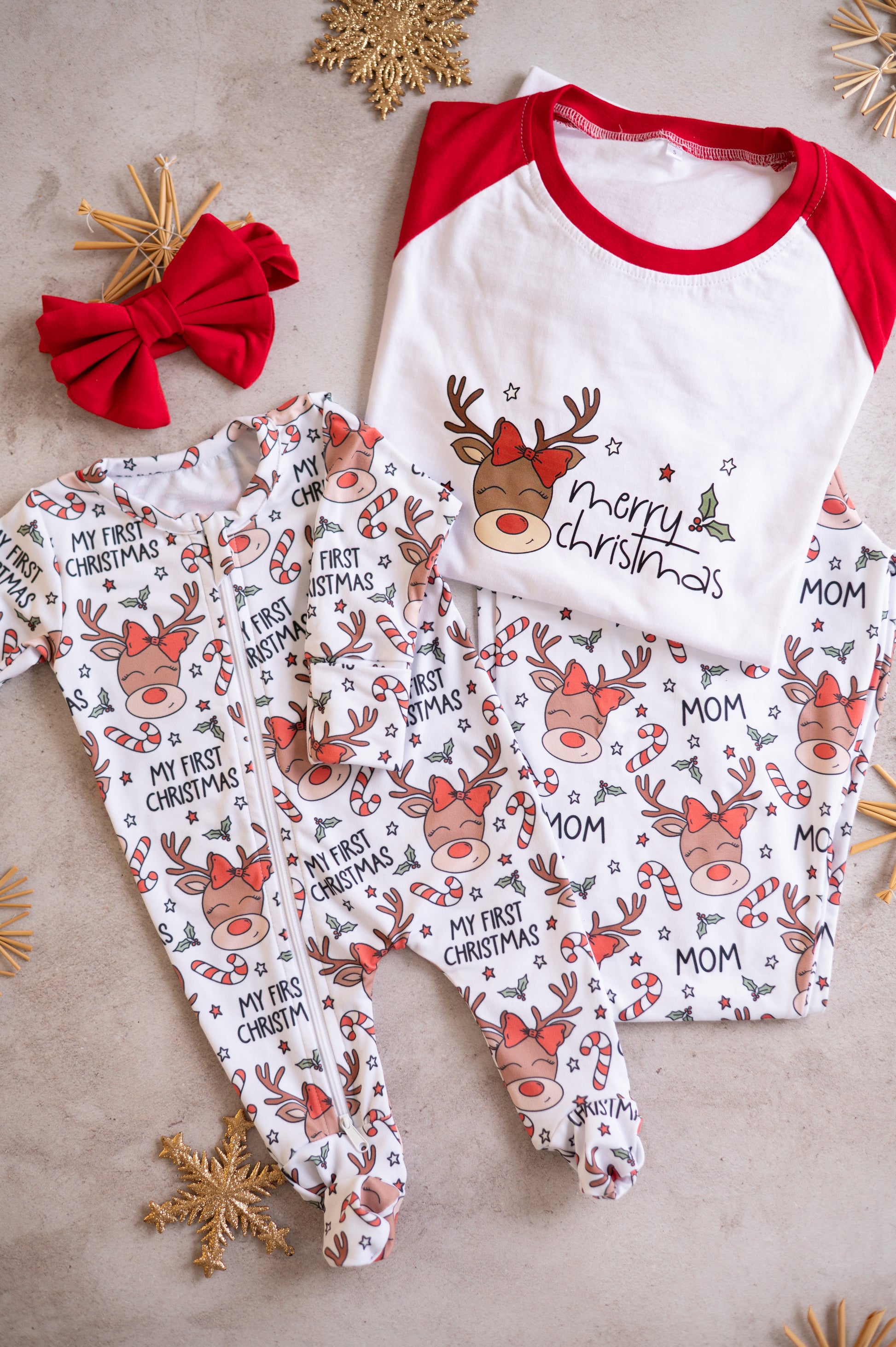 Coordinating pajama pants printed with playful candy canes, holly sprigs, and reindeer faces alongside the word “MOM”, "MAMMA".