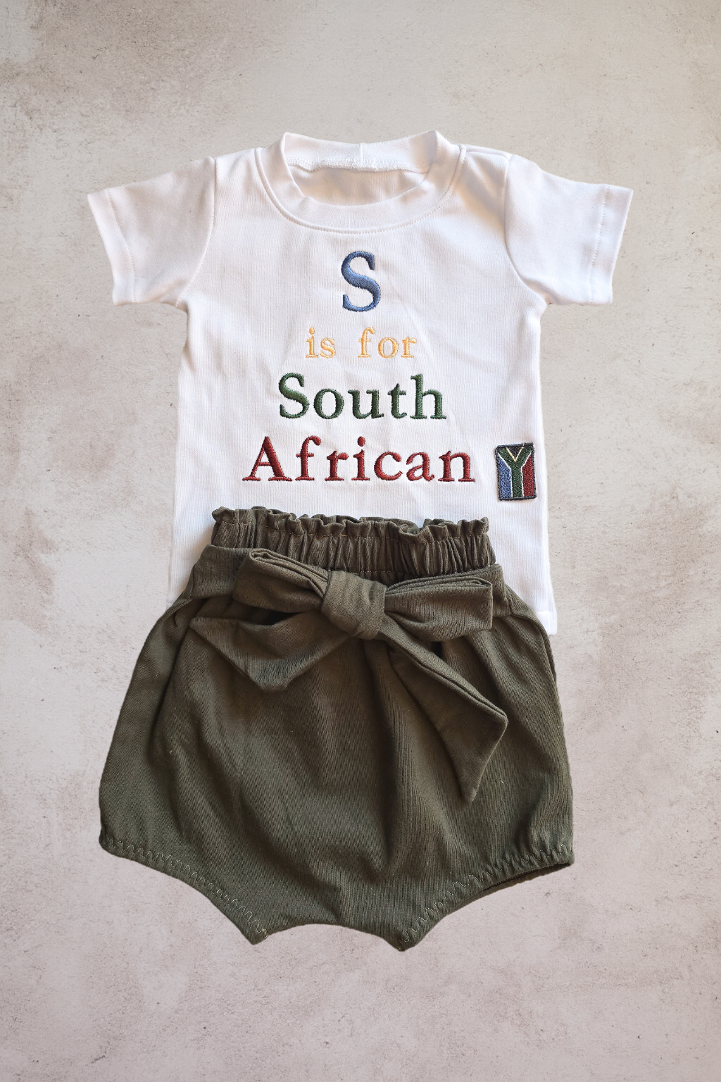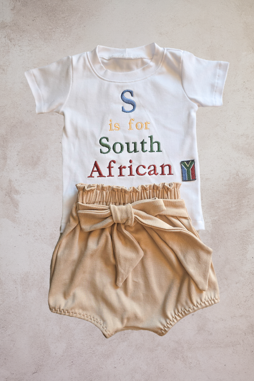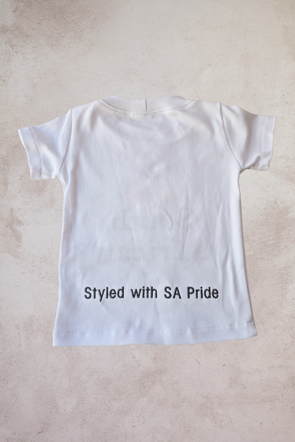 Each letter is carefully stitched in the colours of our nation, carrying with it the promise that heritage is not just remembered — it’s lived and passed on. The tiny flag detail is more than just a symbol, it’s a reminder that our little ones are the future of a country stitched together in love and resilience.And at the back, a little surprise: “Styled with SA Pride” delicately embroidered, a hidden touch that makes this piece extra special,