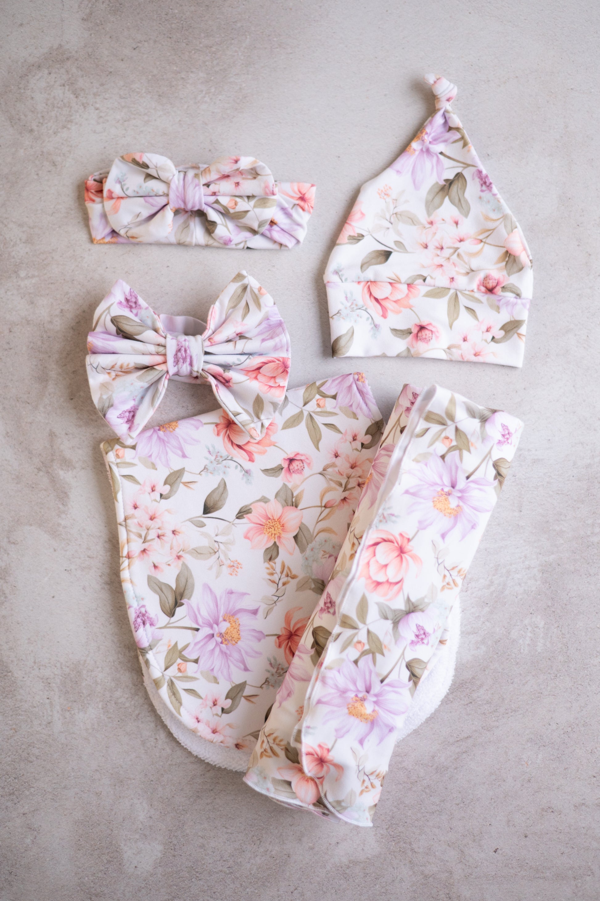 This essential newborn set includes a soft swaddle blanket (measuring 1 x 1 m) and a tie knot beanie or kitty bow headband. Keep your little one cozy and stylish. Perfect for new parents or as a stunning babyshower gift.