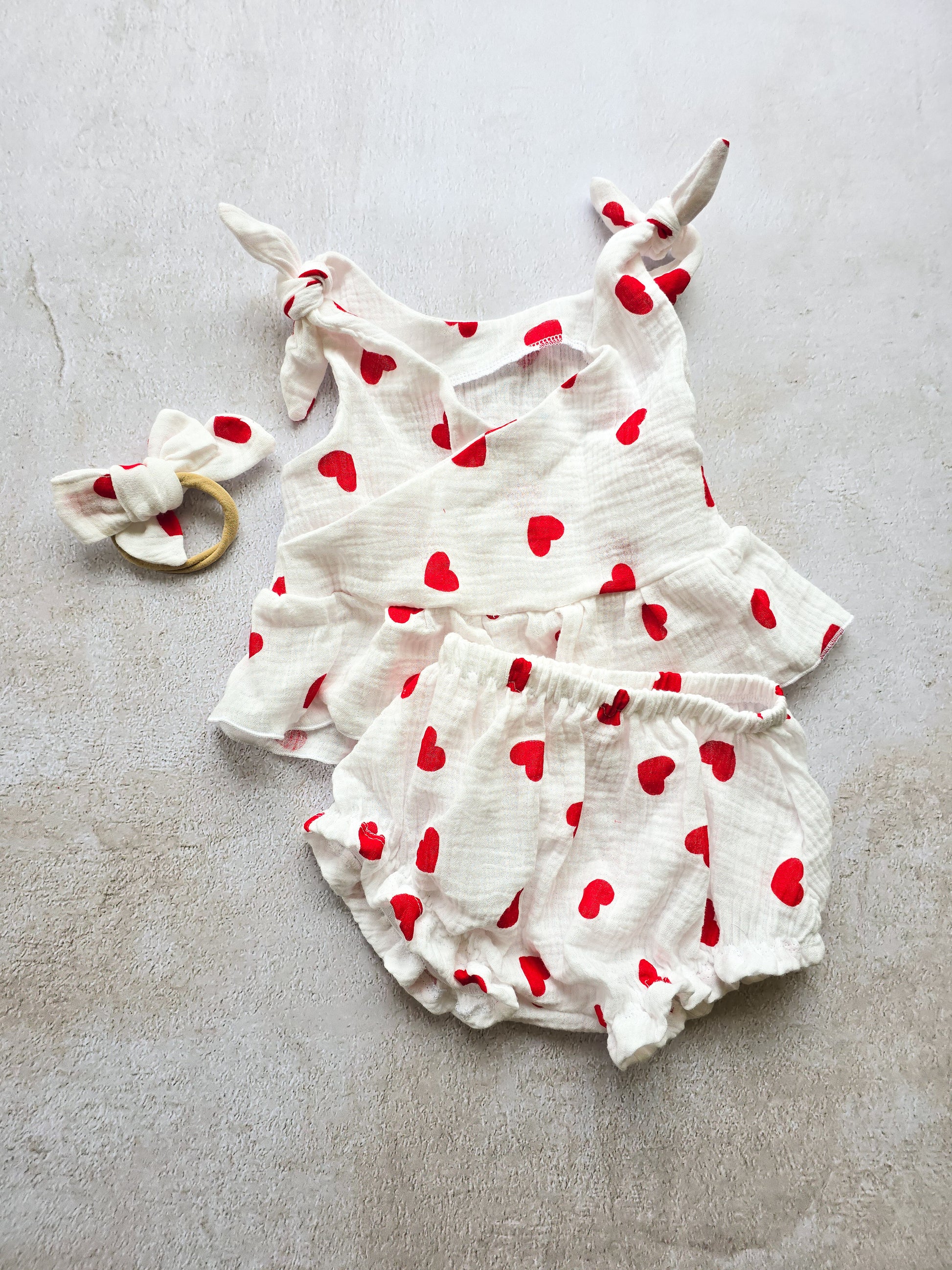 Made with muslin material. The adorable red heart design adds a touch of love to their outfit. A must-have for any Valentine's celebration!